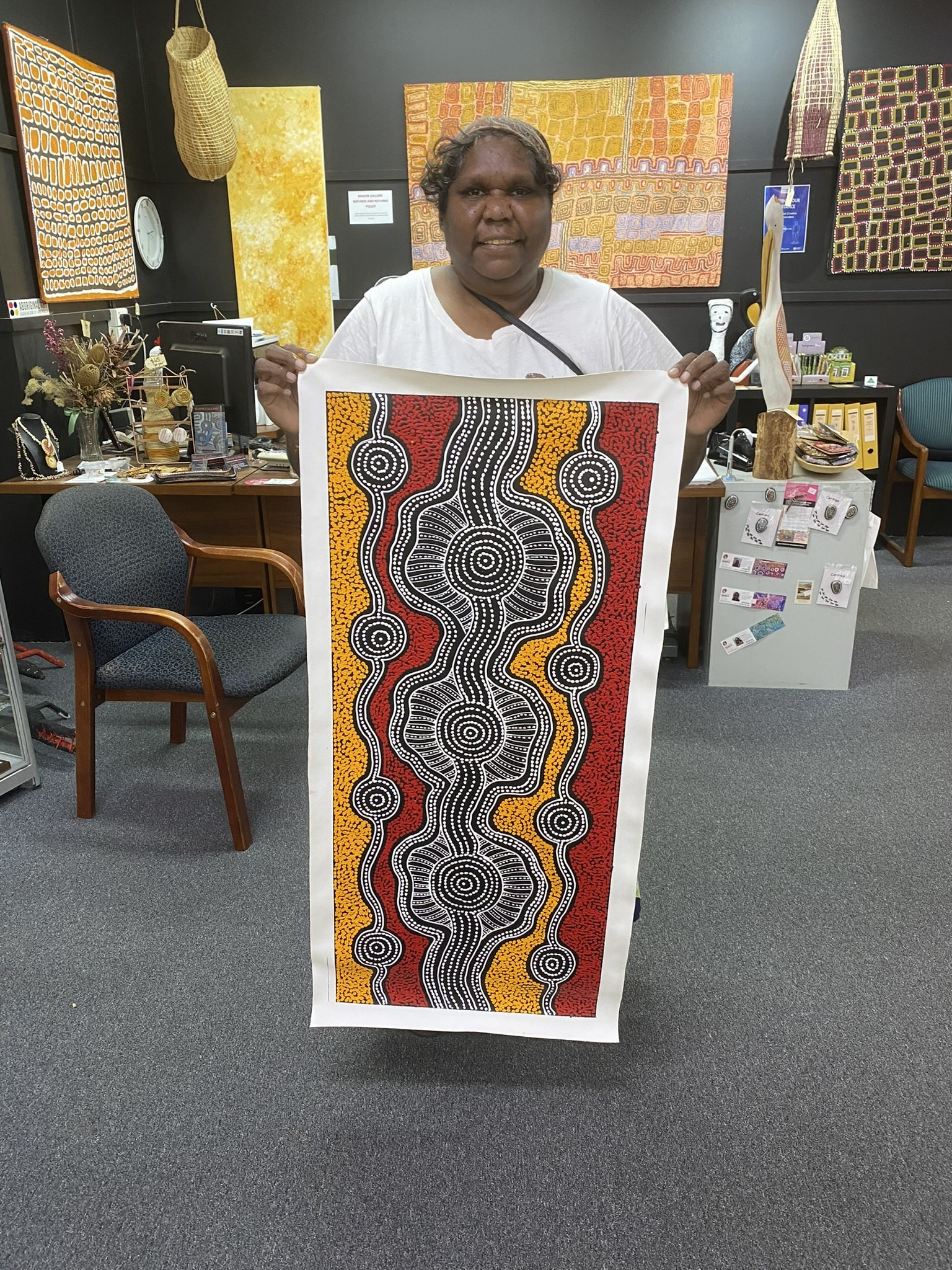 Their works make use of deep, powerful and culturally significant symbolism and tell stories around Emu Dreaming, Water Dreaming, Dingo Dreaming and Bush Medicine Plants, harvested on country.
